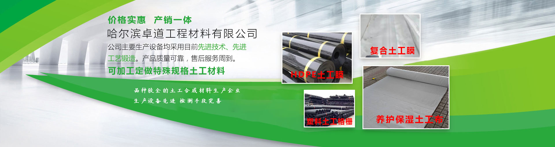 哈尔滨卓道工程材料有限公司目前规模较大,品种较全的土工合成材料专业生产企业,生产设备先进,检测手段完备。公司主要生产设备均采用目前先进技术、先进工艺锻造。产品质量可靠,售后服务周到。